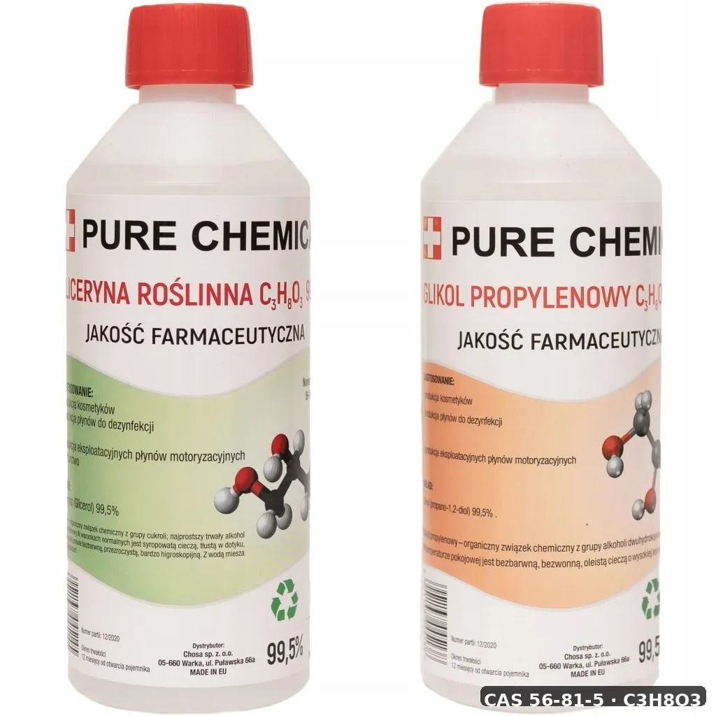 - Wzór chemiczny: C₃H₈O₃ (gliceryna), C₃H₈O₂ (glikol propylenowy)