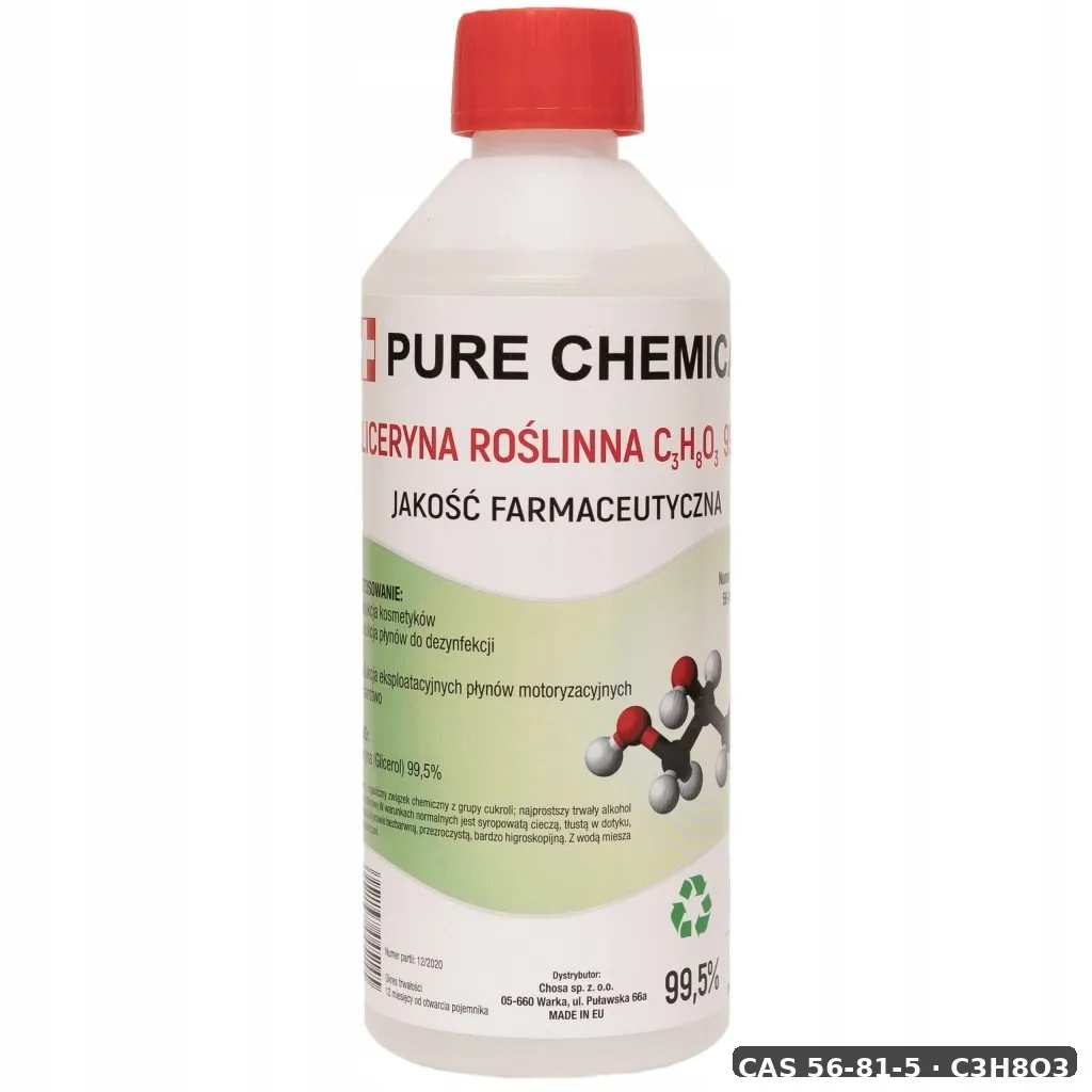 | Synonimy (międzynarodowe, PubChem) | glycerol, glycerin, Glycerine, 1,2,3-Propanetriol, Glycyl alcohol, Trihydroxypropane, Glyceritol, Osmoglyn, 1,2,3-trihydroxypropane, Glyrol |